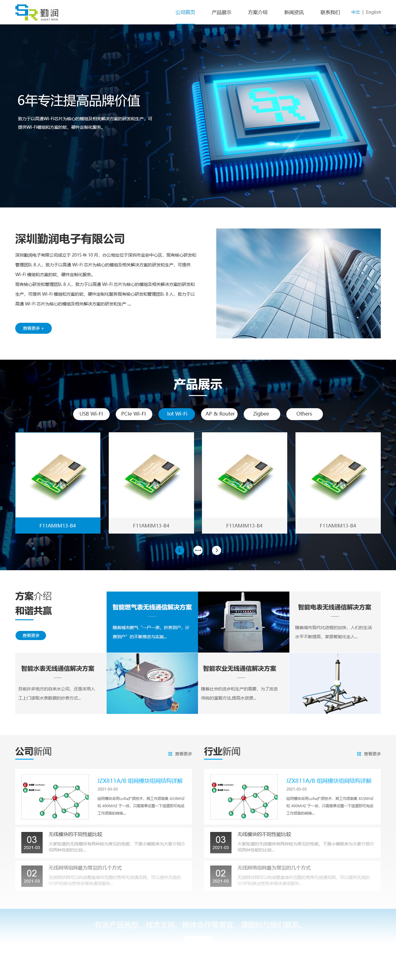 深圳勤潤電子有限公司網站主題內容主要是芯片為核心的模組,該網站采用的是藍色為主色調,設計風格上注重電子行業的屬性,采用科技元素和藍色完美結合,外觀精致、版面呈現了大氣、簡潔、從色彩上來增強企業的品牌識別力,增加瀏覽者的體驗需求。