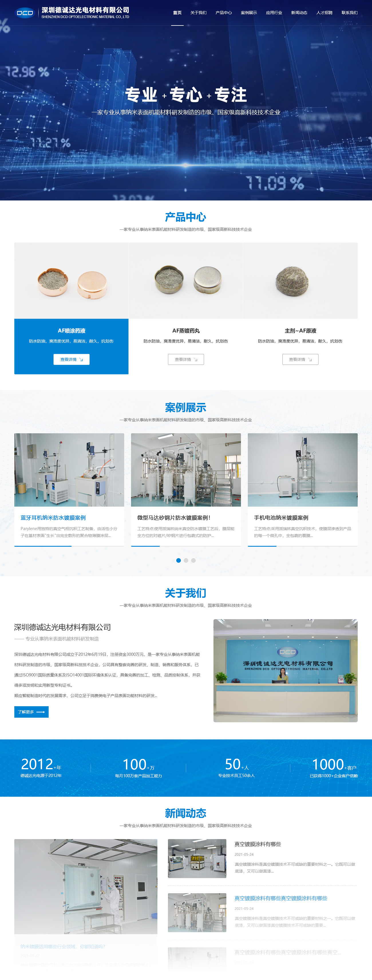 深圳德誠達光電材料有限公司設計版面以藍色為主,在網站設計排版中與客戶積極溝通,增加了科技元素,一直堅持將科技元素與藍色能完美結合的理念。網站最終呈現了高端大氣,簡潔清晰,外觀精致的圖標和排版讓頁面更加附有視覺張力,板塊布局清晰,增加瀏覽體驗需求。