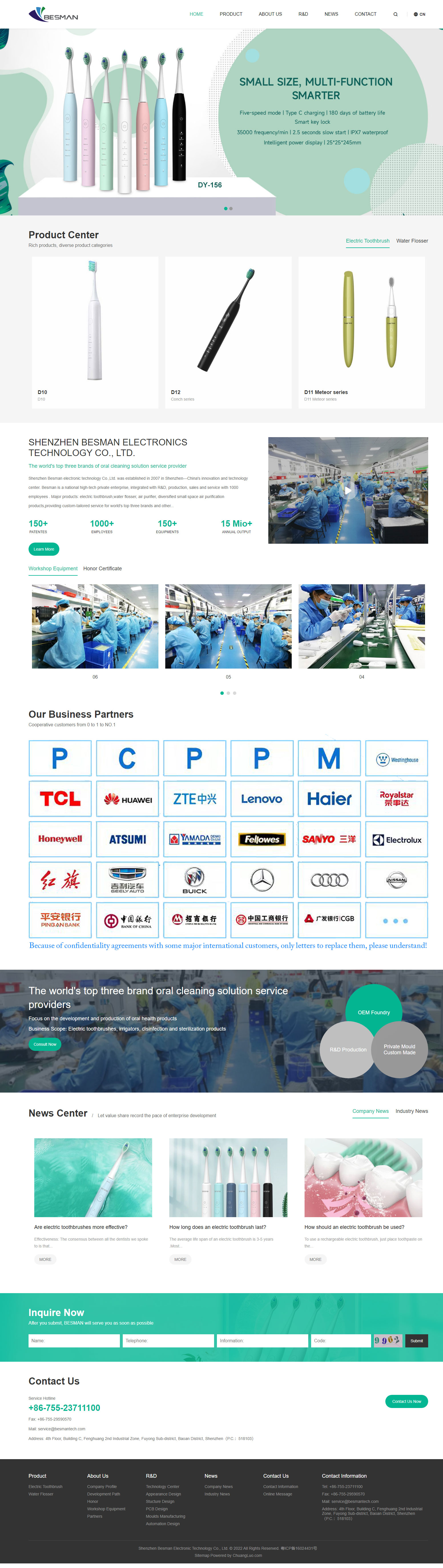 深圳市柏斯曼電子科技股份有限公司網站整個版面內容主要是以淺綠色色為主,此網站主要是做電動牙刷的產品,運用了綠色是突出了產品綠色、環保、無害。排版設計上布局提升網站美觀性、清新性,搭配精美圖片合理布局,使訪問客戶可以更加快速找到想要瀏覽的內容。