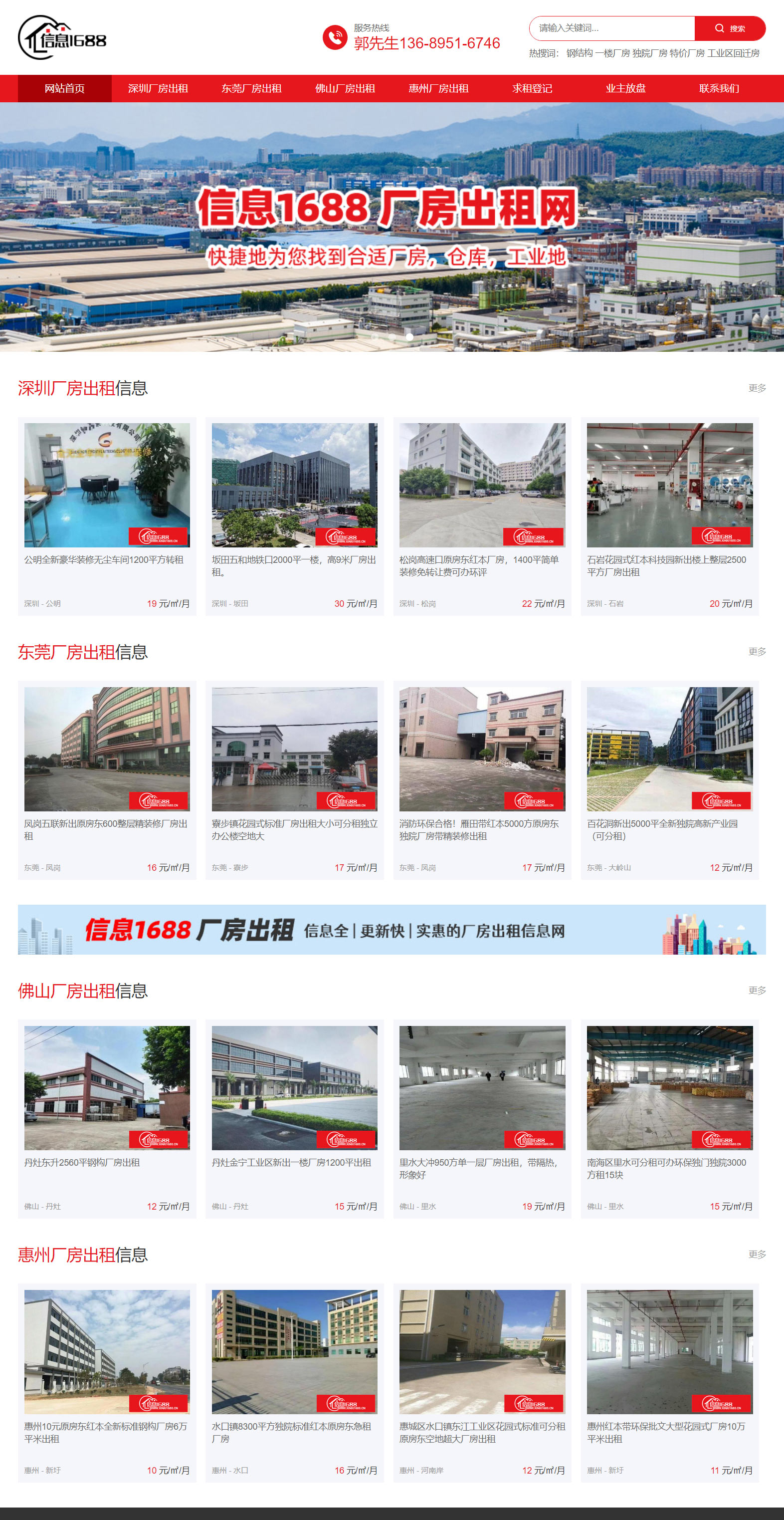 深圳廠房信息網站采用紅色風格,頁面十分清晰簡潔,客戶一覽就可以看到所需地區(qū)得廠房,而且廠房信息量十分大。并采用三合一的網站建設風格。
